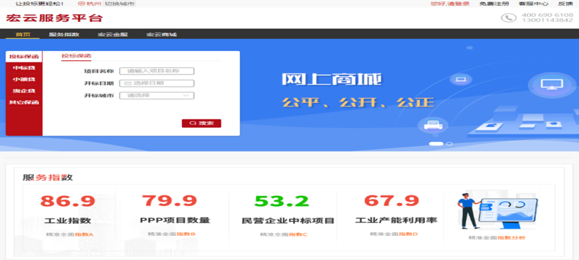 宏云服务平台建设全面围绕国家战略,以“宏云金服、宏云商城、宏云指数”为抓手,专注服务于各级政府机构、金融机构和中小微企业,围绕科技、普惠、全球化战略,通过自主研发的科技创新产品,以深刻的招投标业务认知与数据获取能力助政府数字化理政、助银行数字化转型、助企业生态转型,打造政府、企业、金融机构互联生态链。通过不断创新,实现全国公共资源交易领域统一化监管、市场化发展、电子化转型,实现建立高标准、优服务、强监督的全国公共资源交易服务平台。